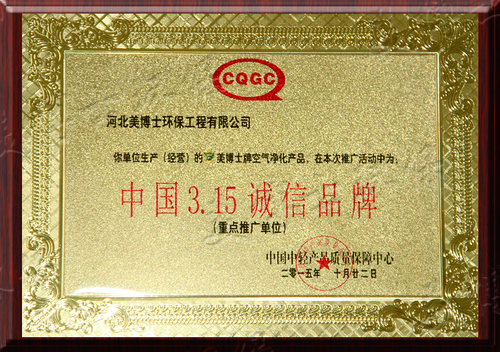 公司因其生產經營的美博士牌空氣凈化產品被中國中輕產品質量保障中心于二零一五年十月二十二日評為中國3·15誠信品牌。美博士環(huán)保會繼續(xù)以其實實在在的產品質量,為國民造福。